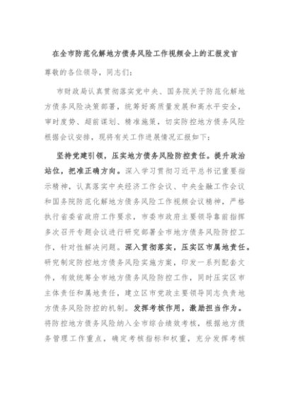 / 【七哥公文】2024年:在全市防范化解地方债务风险工作视频会上的汇报发言+更多免费公文+VX:QiGeGongWen2024