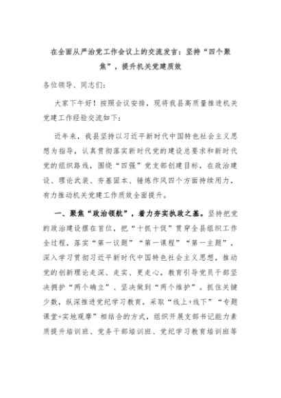 【七哥公文】2024年:在全面从严治党工作会议上的交流发言:坚持“四个聚焦”,提升机关党建质效+更多免费公文+VX:QiGeGongWen2024