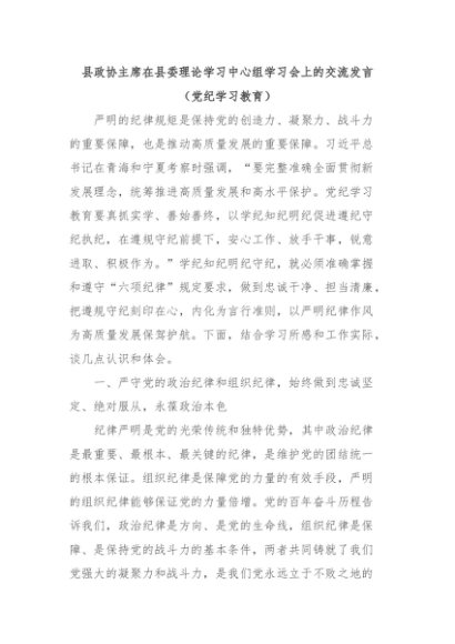 【七哥公文】2024年:县政协主席在县委理论学习中心组学习会上的交流发言(党纪学习教育)+更多免费公文+VX:QiGeGongWen2024