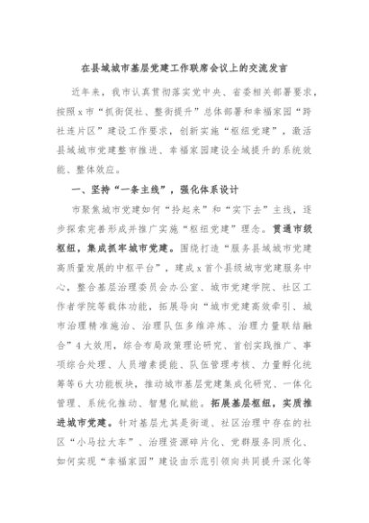 / 【七哥公文】2024年:在县域城市基层党建工作联席会议上的交流发言+更多免费公文+VX:QiGeGongWen2024