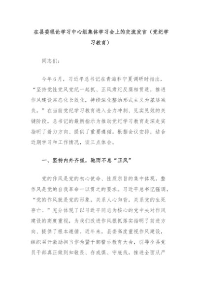 【七哥公文】2024年:在县委理论学习中心组集体学习会上的交流发言(党纪学习教育)+更多免费公文+VX:QiGeGongWen2024