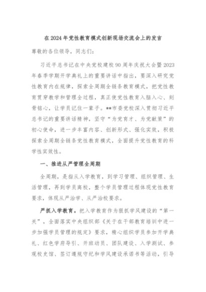 / 【七哥公文】2024年:在2024年党性教育模式创新现场交流会上的发言+更多免费公文+VX:QiGeGongWen2024