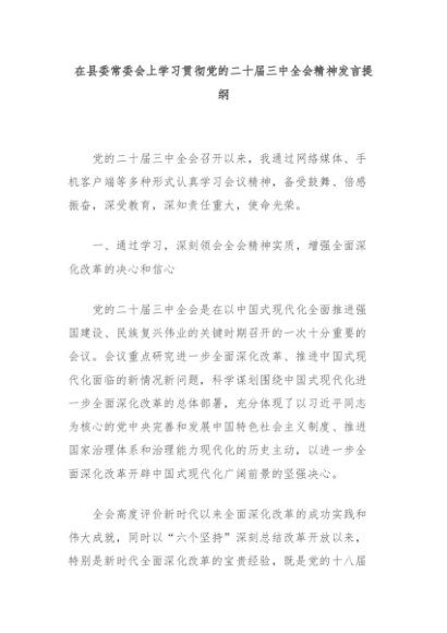 【七哥公文】2024年:在县委常委会上学习贯彻党的二十届三中全会精神发言提纲+更多免费公文+VX:QiGeGongWen2024