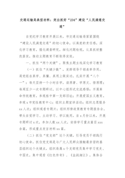 【七哥公文】2024年:交通运输局典型材料:突出抓好“234”建设“人民满意交通”+更多免费公文+VX:QiGeGongWen2024
