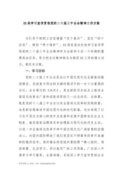/ 【七哥公文】2024年:XX局学习宣传贯彻党的二十届三中全会精神工作方案+更多免费公文+VX:QiGeGongWen2024