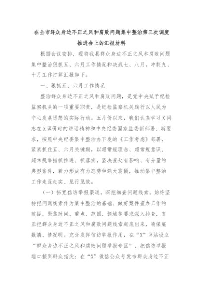 【七哥公文】2024年:在全市群众身边不正之风和腐败问题集中整治第三次调度推进会上的汇报材料+更多免费公文+VX:QiGeGongWen2024