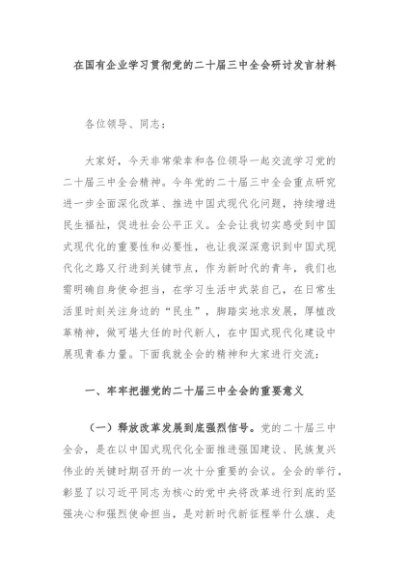 【七哥公文】2024年:在国有企业学习贯彻党的二十届三中全会研讨发言材料 (1)+更多免费公文+VX:QiGeGongWen2024