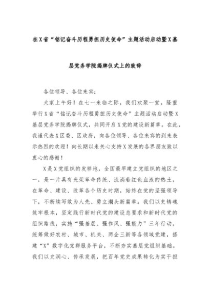 【七哥公文】2024年:在X省“铭记奋斗历程勇担历史使命”主题活动启动暨X基层党务学院揭牌仪式上的致辞+更多免费公文+VX:QiGeGongWen2024