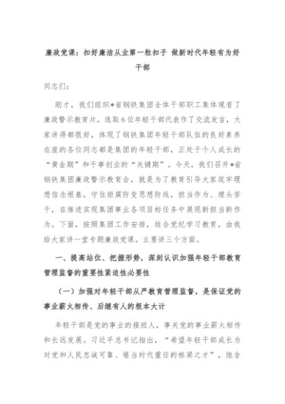 【七哥公文】2024年:廉政党课:扣好廉洁从业第一粒扣子 做新时代年轻有为好干部+更多免费公文+VX:QiGeGongWen2024
