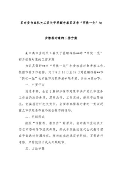 【七哥公文】2024年:某市委市直机关工委关于差额考察某某市“两优一先”初步推荐对象的工作方案+更多免费公文+VX:QiGeGongWen2024