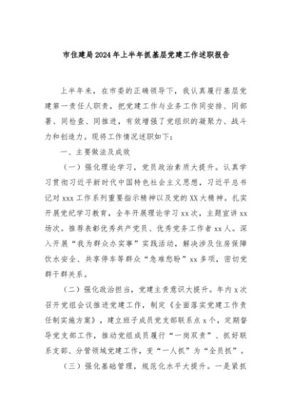 / 【七哥公文】2024年:市住建局2024年上半年抓基层党建工作述职报告+更多免费公文+VX:QiGeGongWen2024