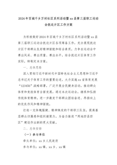 【七哥公文】2024年:2024年百城千乡万村社区系列活动暨xx县第三届职工运动会抚边片区工作方案+更多免费公文+VX:QiGeGongWen2024