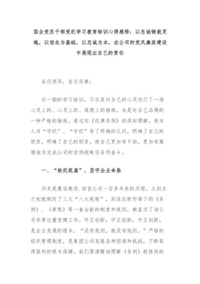 【七哥公文】2024年:国企党员干部党纪学习教育培训心得感悟:以忠诚铸就灵魂,以信念为基础,以忠诚为本,在公司的党风廉政建设中展现出自己的责任+更多免费公文+VX:QiGeGongWen2024
