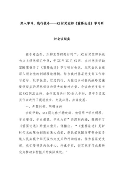 【七哥公文】2024年:深入学习,践行使命——XX村党支部《重要论述》学习研讨会议纪实+更多免费公文+VX:QiGeGongWen2024