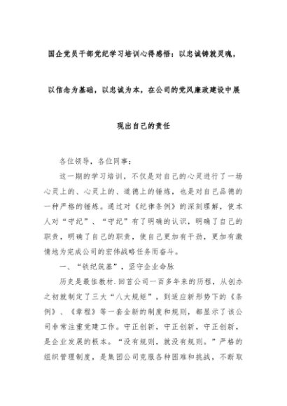 【七哥公文】2024年:国企党员干部党纪学习培训心得感悟:以忠诚铸就灵魂,以信念为基础,以忠诚为本,在公司的党风廉政建设中展现出自己的责任+更多免费公文+VX:QiGeGongWen2024