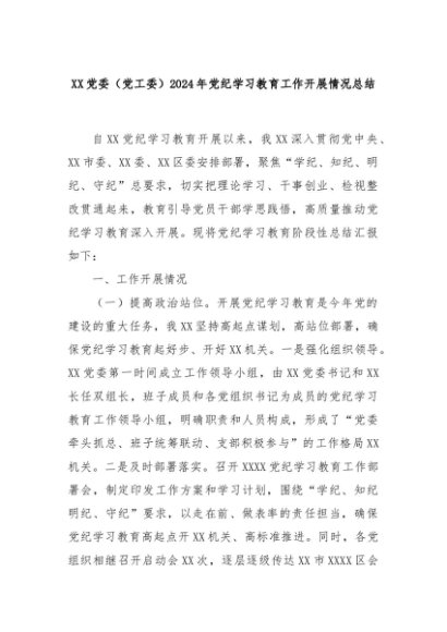 【七哥公文】2024年:XX党委(党工委)2024年党纪学习教育工作开展情况总结 (1)+更多免费公文+VX:QiGeGongWen2024