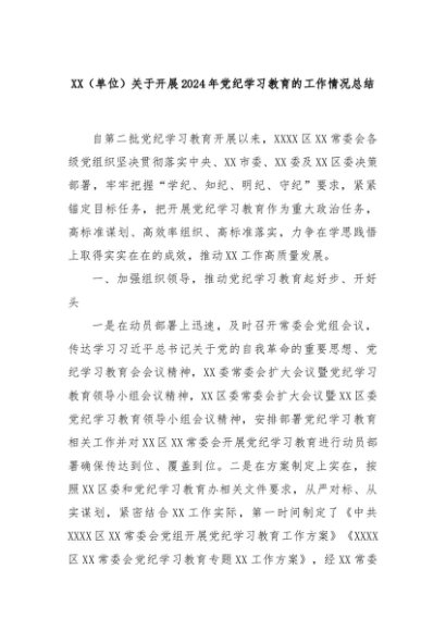 【七哥公文】2024年:XX(单位)关于开展2024年党纪学习教育的工作情况总结 (1)+更多免费公文+VX:QiGeGongWen2024