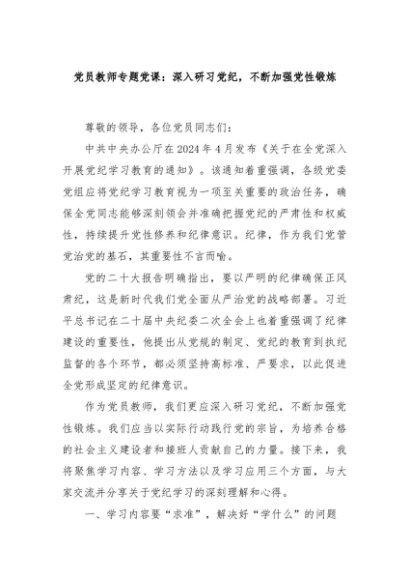 / 【七哥公文】2024年:党员教师专题党课:深入研习党纪,不断加强党性锻炼+更多免费公文+VX:QiGeGongWen2024
