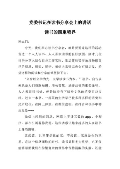 / 【七哥公文】2024年:党委书记在读书分享会上的讲话读书的四重境界+更多免费公文+VX:QiGeGongWen2024