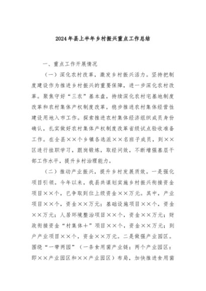 / 【七哥公文】2024年:2024年县上半年乡村振兴重点工作总结+更多免费公文+VX:QiGeGongWen2024