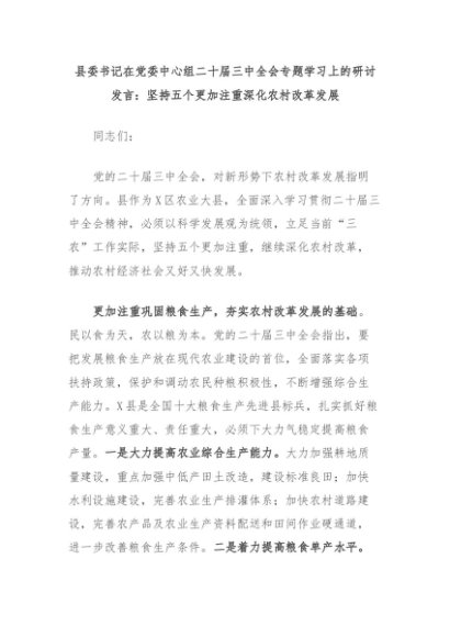 【七哥公文】2024年:县委书记在党委中心组二十届三中全会专题学习上的研讨发言:坚持五个更加注重深化农村改革发展 (1)+更多免费公文+VX:QiGeGongWen2024