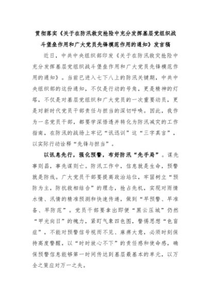 【七哥公文】2024年:贯彻落实《关于在防汛救灾抢险中充分发挥基层党组织战斗堡垒作用和广大党员先锋模范作用的通知》发言稿+更多免费公文+VX:QiGeGongWen2024
