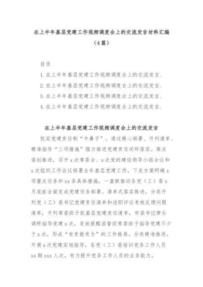 【七哥公文】2024年:(4篇)在上半年基层党建工作视频调度会上的交流发言材料汇编+更多免费公文+VX:QiGeGongWen2024