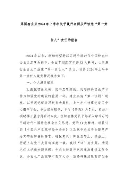 【七哥公文】2024年:某国有企业2024年上半年关于履行全面从严治党“第一责任人”责任的报告+更多免费公文+VX:QiGeGongWen2024