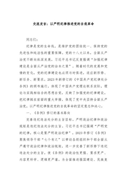 / 【七哥公文】2024年:交流发言:以严明纪律推进党的自我革命+更多免费公文+VX:QiGeGongWen2024