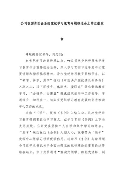 【七哥公文】2024年:公司在国资国企系统党纪学习教育专题推进会上的汇报发言+更多免费公文+VX:QiGeGongWen2024