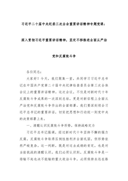 【七哥公文】2024年:习总书记二 十届中央纪委三次全会重要讲话精神专题党课:深入贯彻习总书记重要讲话精神,坚定不移推进全面从严治党和反腐败斗争+更多免费公文+VX:QiGeGongWen2024