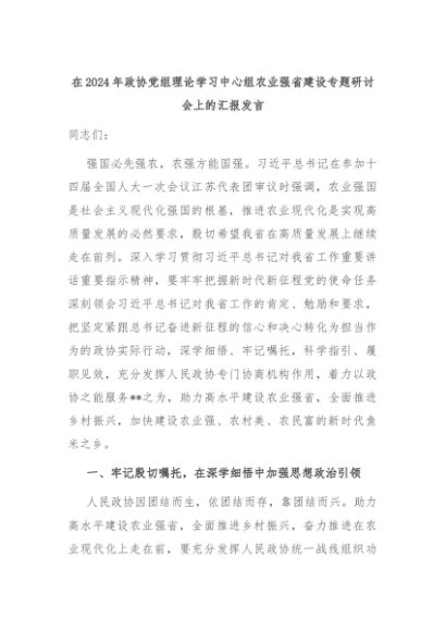 【七哥公文】2024年:在2024年政协党组理论学习中心组农业强省建设专题研讨会上的汇报发言+更多免费公文+VX:QiGeGongWen2024