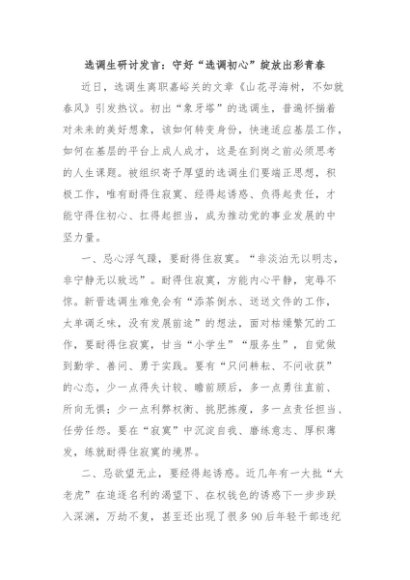 【七哥公文】2024年:选调生研讨发言:守好“选调初心”绽放出彩青春+更多免费公文+VX:QiGeGongWen2024