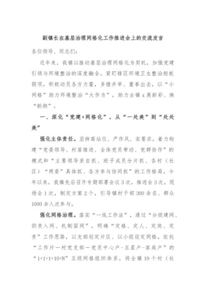 / 【七哥公文】2024年:副镇长在基层治理网格化工作推进会上的交流发言+更多免费公文+VX:QiGeGongWen2024