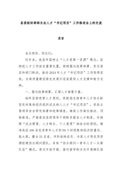 【七哥公文】2024年:县委组织部部长在人才“书记项目”工作推进会上的交流发言+更多免费公文+VX:QiGeGongWen2024