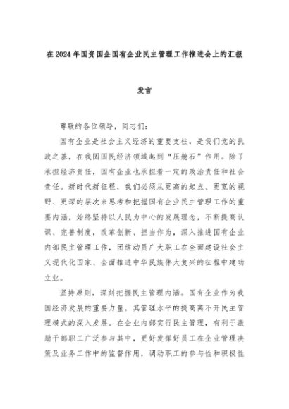 【七哥公文】2024年:在2024年国资国企国有企业民主管理工作推进会上的汇报发言+更多免费公文+VX:QiGeGongWen2024