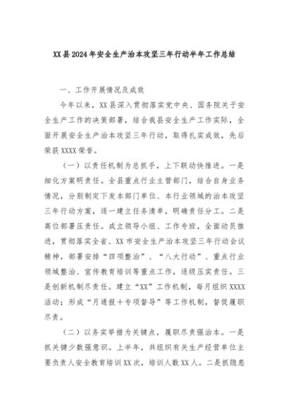 【七哥公文】2024年:XX县2024年安全生产治本攻坚三年行动半年工作总结+更多免费公文+VX:QiGeGongWen2024