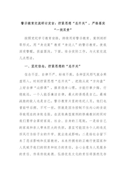 【七哥公文】2024年:警示教育交流研讨发言:拧紧思想“总开关”,严格落实“一岗双责”+更多免费公文+VX:QiGeGongWen2024