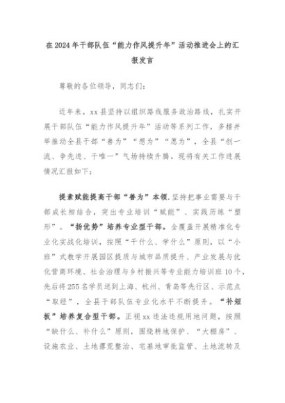 【七哥公文】2024年:在2024年干部队伍“能力作风提升年”活动推进会上的汇报发言+更多免费公文+VX:QiGeGongWen2024