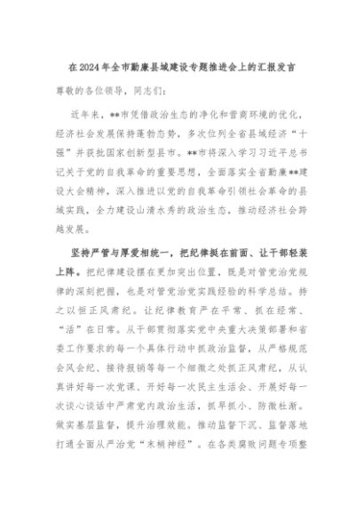 【七哥公文】2024年:在2024年全市勤廉县域建设专题推进会上的汇报发言+更多免费公文+VX:QiGeGongWen2024
