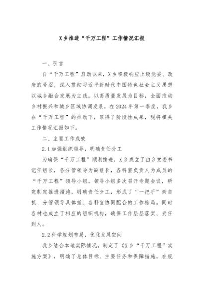 / 【七哥公文】2024年:X乡推进“千万工程”工作情况汇报+更多免费公文+VX:QiGeGongWen2024