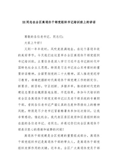 / 【七哥公文】2024年:XX同志在全区离退休干部党组织书记培训班上的讲话+更多免费公文+VX:QiGeGongWen2024