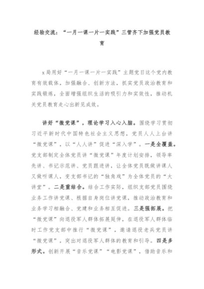 【七哥公文】2024年:经验交流:“一月一课一片一实践”三管齐下加强党员教育+更多免费公文+VX:QiGeGongWen2024