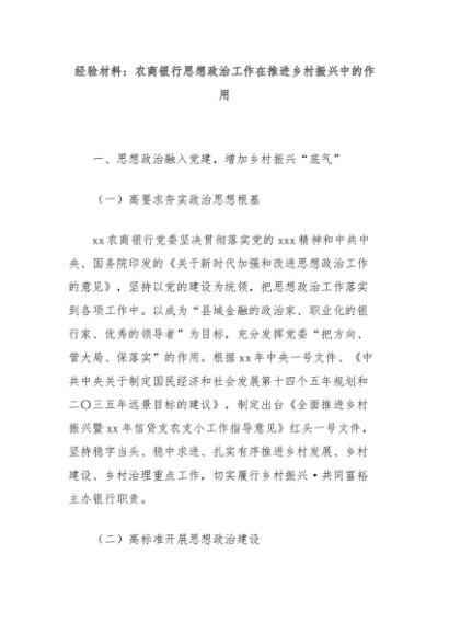 【七哥公文】2024年:经验材料:农商银行思想政治工作在推进乡村振兴中的作用+更多免费公文+VX:QiGeGongWen2024