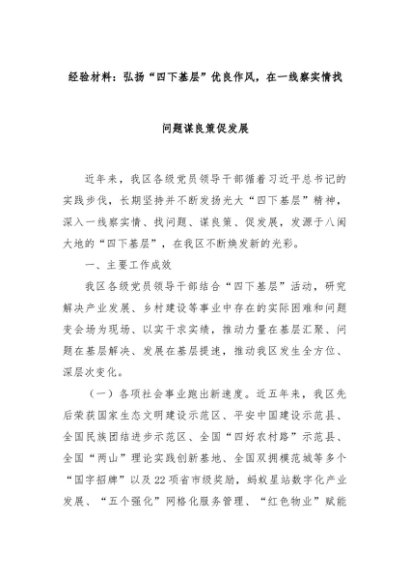 【七哥公文】2024年:经验材料:弘扬“四下基层”优良作风,在一线察实情找问题谋良策促发展+更多免费公文+VX:QiGeGongWen2024
