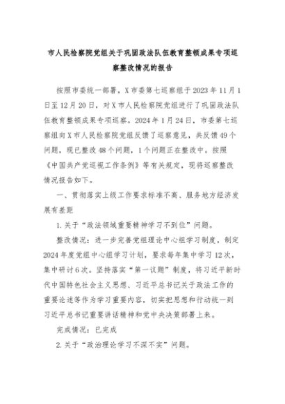 【七哥公文】2024年:市人民检察院党组关于巩固政法队伍教育整顿成果专项巡察整改情况的报告+更多免费公文+VX:QiGeGongWen2024