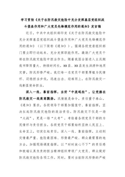 【七哥公文】2024年:学习贯彻《关于在防汛救灾抢险中充分发挥基层党组织战斗堡垒作用和广大党员先锋模范作用的通知》发言稿+更多免费公文+VX:QiGeGongWen2024