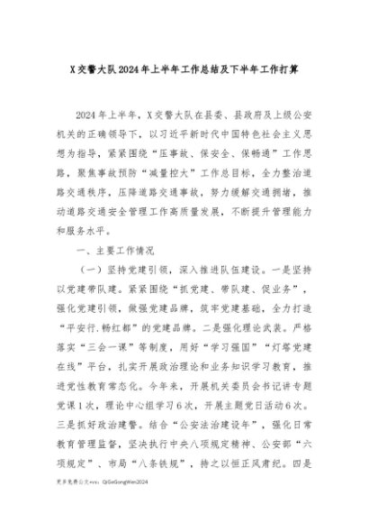 【七哥公文】2024年:X交警大队2024年上半年工作总结及下半年工作打算+更多免费公文+VX:QiGeGongWen2024