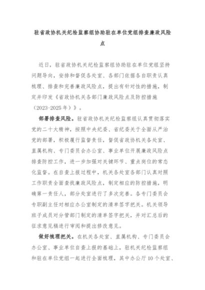 【七哥公文】2024年:驻省政协机关纪检监察组协助驻在单位党组排查廉政风险点+更多免费公文+VX:QiGeGongWen2024