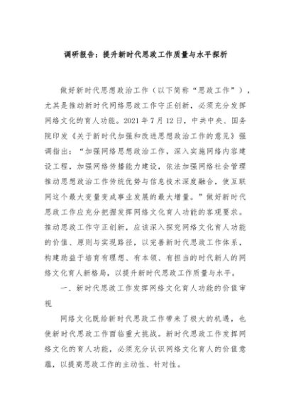【七哥公文】2024年:调研报告:提升新时代思政工作质量与水平探析+更多免费公文+VX:QiGeGongWen2024